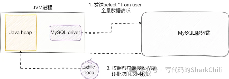 复制id|select_type|table |partitions|type |possible_keys|key |key_len|ref|rows |filtered|Extra | --+-----------+------+----------+-----+-------------+-------+-------+---+-------+--------+-----------+ 1|SIMPLE |t_user| |range|PRIMARY |PRIMARY|8 | |1496520| 100.0|Using where|1.2.3. 2. 流式查询另外一种解决方案就是流式查询,免费源码下载通过流式查询将SQL语句直接提交给MySQL服务端,让服务端按照客户端程序接受程度不断推送数据,然后我们的java程序每次收集50w的数据,再写入到对应的excel文件中: