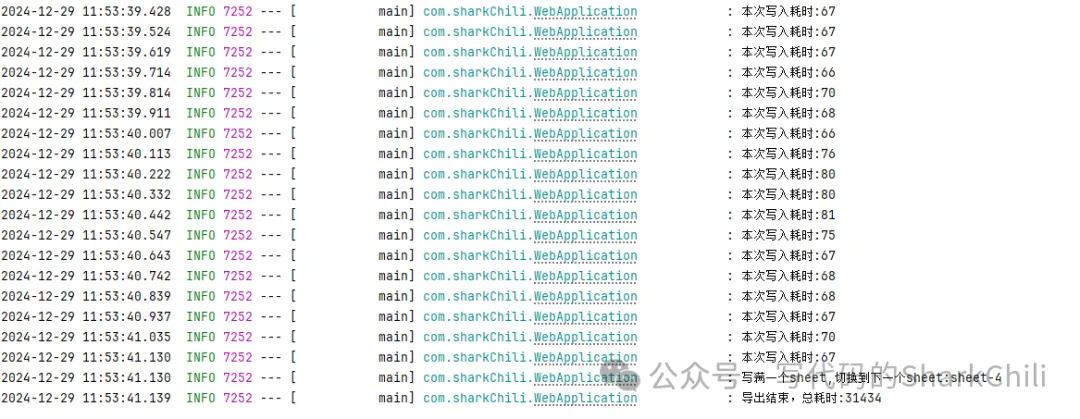 复制long start = System.currentTimeMillis(); UserMapper userMapper = SpringUtil.getBean(UserMapper.class); //设置导出的文件名 String fileName = "F://tmp/result.xlsx"; //设置excel的sheet号码,用原子类保证可以在lambda表达式中通过编译 AtomicInteger sheetNo = new AtomicInteger(1); //设置第一个sheet的名字,用原子类保证可以在lambda表达式中通过编译 AtomicReference<String> sheetName = new AtomicReference<>("sheet-" + sheetNo.get()); // 创建writeSheet,用原子类保证可以在lambda表达式中通过编译 WriteSheet writeSheet = EasyExcel.writerSheet(sheetNo.get(), sheetName.get()).build(); AtomicReference<WriteSheet> writeSheetRef = new AtomicReference<>(writeSheet); List<User> userList = new ArrayList<>(); AtomicReference<List<User>> userListRef = new AtomicReference<>(userList); //记录导出的size AtomicInteger atomicCount = new AtomicInteger(0); //指定文件 try (ExcelWriter excelWriter = EasyExcel.write(fileName, User.class).build()) { userMapper.selectListByStream(res -> { //存入list中 User user = res.getResultObject(); userListRef.get().add(user); atomicCount.incrementAndGet(); //50w执行一次导出写入 if (userListRef.get().size() % 1_0000 == 0) { long writeStart = System.currentTimeMillis(); //写入到文件 excelWriter.write(userListRef.get(), writeSheetRef.get()); //清空列表内部数据 userListRef.get().clear(); long writeEnd = System.currentTimeMillis(); log.info("本次写入耗时:{}", writeEnd - writeStart);} //写入100w条后,切换sheet if (atomicCount.get() % 100_0000 == 0) { //自增sheetNo sheetNo.incrementAndGet(); //修改sheetName sheetName.set("sheet-" + sheetNo.get()); //写入文件 writeSheetRef.set(EasyExcel.writerSheet(sheetNo.get(), sheetName.get()).build()); log.info("写满一个sheet,切换到下一个sheet:{}", sheetName);} }); //检查是否还有未写入的文件 if (CollectionUtil.isNotEmpty(userList)) { log.info("存在未写入完成的数据,size:{}", userList.size()); excelWriter.write(userList, writeSheetRef.get());} long total = System.currentTimeMillis() - start; log.info("导出结束,总耗时:{}", total);} catch (Exception e) { thrownew RuntimeException(e); }1.2.3.4.5.6.7.8.9.10.11.12.13.14.15.16.17.18.19.20.21.22.23.24.25.26.27.28.29.30.31.32.33.34.35.36.37.38.39.40.41.42.43.44.45.46.47.48.49.50.51.52.53.54.55.56.57.58.59.60.61.62.63.64.65.66.67.最终这种方案的执行耗时在最好的情况下差不多30s左右,总的来说流式查询天然内存友好且游标式顺序前进的特定,对于这种并发场景下的数据导出是非常友好的,所以这种方案也是笔者比较推荐的方案:
