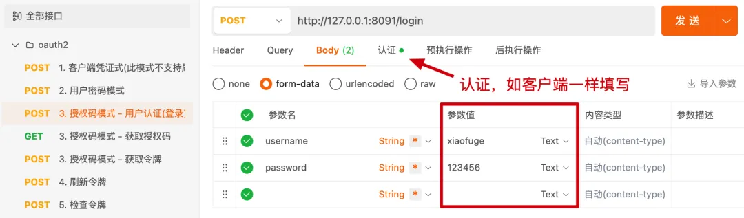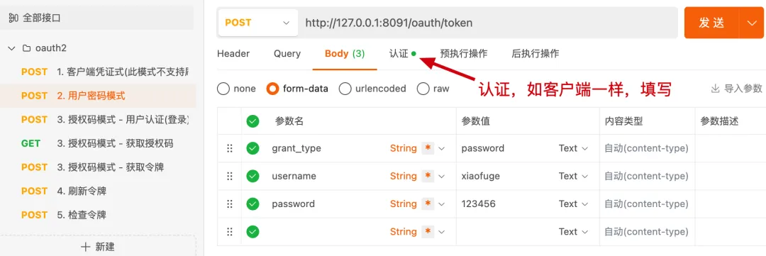 复制spring: datasource: username: root password: 123456 url: jdbc:mysql://192.168.1.109:13306/xfg-dev-tech-oauth2?useUnicode=true&characterEncoding=utf8&autoRecnotallow=true&zeroDateTimeBehavior=convertToNull&serverTimeznotallow=Asia/Shanghai&useSSL=true driver-class-name: com.mysql.cj.jdbc.Driver1.2.3.4.5.6. 关于 ApiPost 的测试,你可以直接从工程中的 json 导入的你的 ApiPost 就可以使用了。3.1 客户端凭证