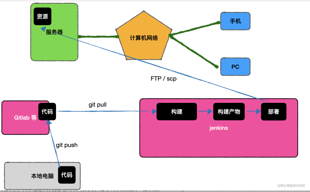 我们代码会提交到 gitlab 等代码库,然后 jenkins 从这些代码库里把代码下载下来进行 build,再把产物上传到服务器上。