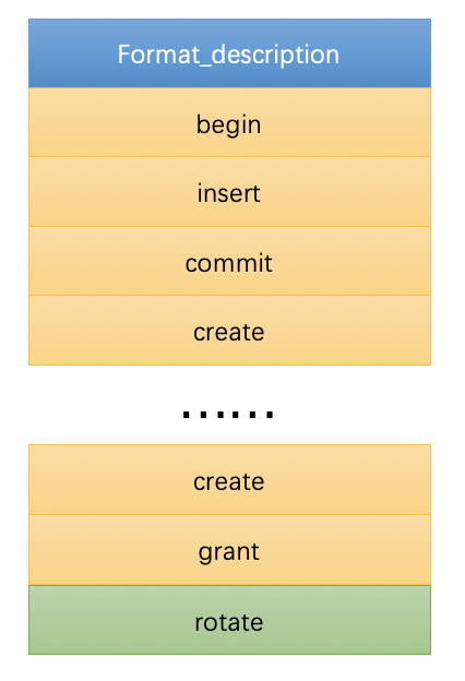 如果 MySQL 服务关闭或者重启,那么 MySQL 进程会自动创建一个新的 binlog,同时写入一个新的 Format_description。简单来说 Format_description 就是一个文件头。rotate 则包含下一个 binlog 的文件信息,它由 MySQL 写完 binlog 后添加到 binlog 的末尾,注意 rotate 只有当 binlog 写完才会有,binlog 没有写完的情况下是没有 rotate 的。