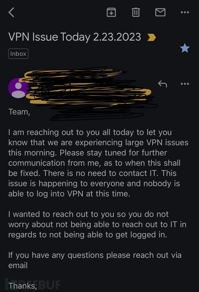 The Verge发表的一份报告还显示了一封发给Dish Network员工的内部邮件,管理层通知他们正在发生的 "VPN问题"。