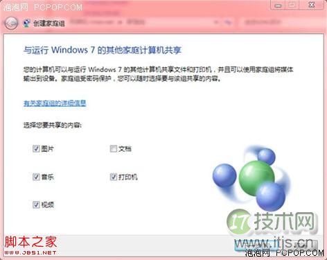 打开创建家庭网的向导,首先选择要与家庭网络共享的文件类型,默认共享的内容是图片、音乐、视频、文档和打印机5个选项,除了打印机以外,其他4个选项分别对应系统中默认存在的几个共享文件。
