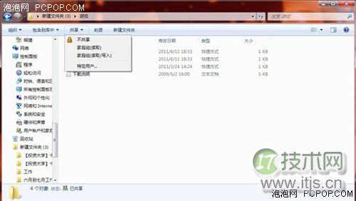 在Windows 7系统中,文件夹的共享更比WinXP方便很多,只需在Windows 7资源管理器中选择要共享的文件夹,点击资源管理器上方菜单栏中的“共享”,并在菜单中设置共享权限即可。假如只允许自己的Windows 7家庭网络中其他电脑访问此共享资源,那么就选择“家庭网络(读取)”;假如允许其它电脑访问并修改此共享资源,那么就选择“家庭组网(读取/写入)”。设置好共享权限后,Windows 7会弹出一个确认对话框,此时点击“是,共享这些选项”就完成了共享操作,很简单吧。
