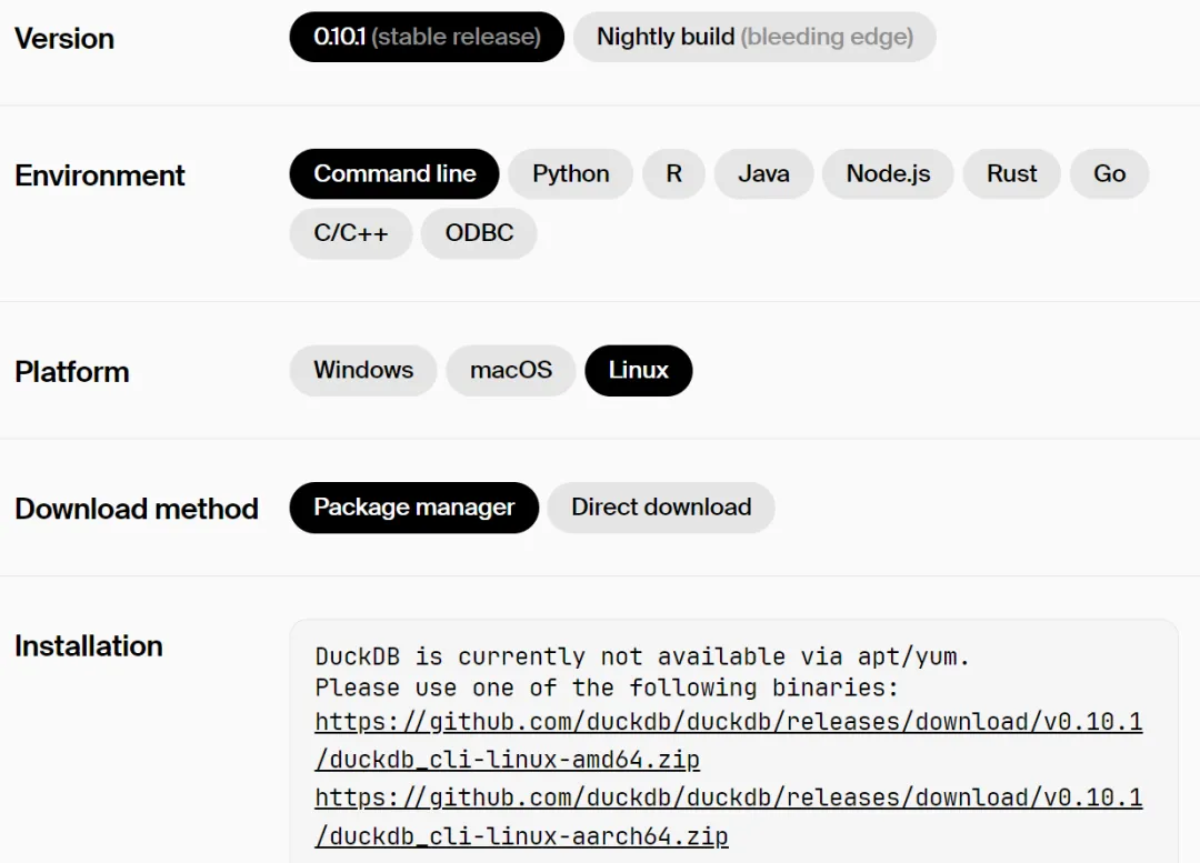DuckDB 提供了非常简单的安装方法,从官网 duckdb.org 直接下载安装解压即可使用。此外,DuckDB 还可以内置在多种开发语言中使用,下文会以 Python 举例说明。