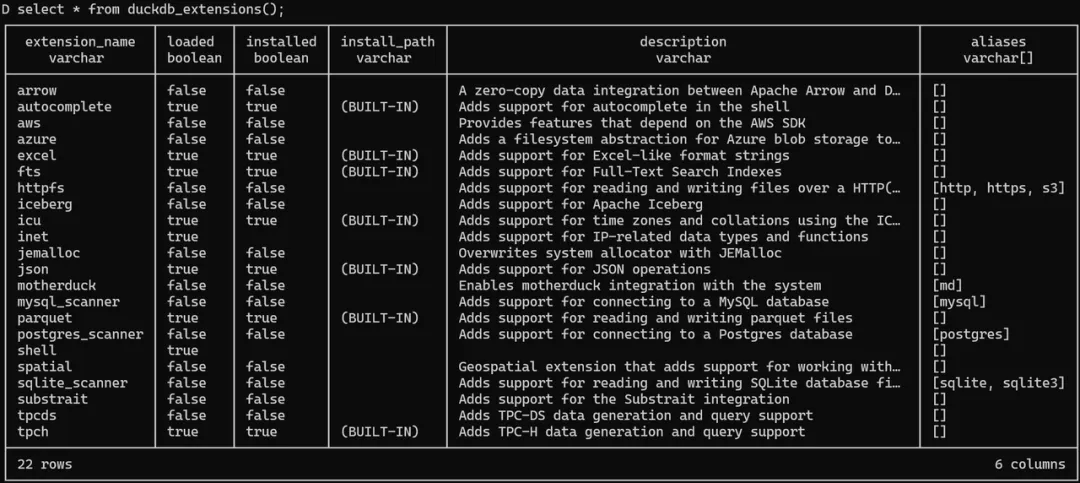 复制[root@hfserver1 soft]# pip install duckdb [root@hfserver1 soft]# cat test.py import duckdb con = duckdb.connect("file.db") con.sql("CREATE TABLE test (i INTEGER)") con.sql("INSERT INTO test VALUES (42)") con.table("test").show() con.close() [root@hfserver1 soft]# python test.py ┌───────┐ │ i │ │ int32 │ ├───────┤ │ 42 │ └───────┘1.2.3.4.5.6.7.8.9.10.11.12.13.14.15.16.17.18. 6).插件扩展DuckDB 通过插件进行能力的扩展,其支持很多不同的插件,能够通过 INSTALL 和 LOAD来进行开关,可以使用 shared library 的方式进行加载。很多核心特性都是通过插件来实现的,例如:time zone, json, sqlite_scanner 等。下图是 DuckDB 内置的一些插件。