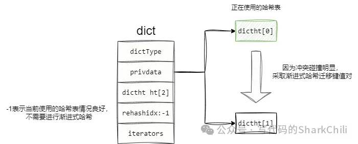 复制typedef struct dict { //....... //定义2个哈希表 dictht ht[2]; //-1时表示当前哈希表处于渐进式哈希 int rehashidx; /* rehashing not in progress if rehashidx == -1 */ //....... } dict;1.2.3.4.5.6.7.8.如下图所示,可以看到dict的数据结构定义了大小为2的哈希表数组,当某个哈希表碰撞激烈需要进行调整时,就会采用渐进式哈希算法将键值对存到dictht[1],并通过rehashidx标志为-1表示当前处于渐进式哈希阶段: