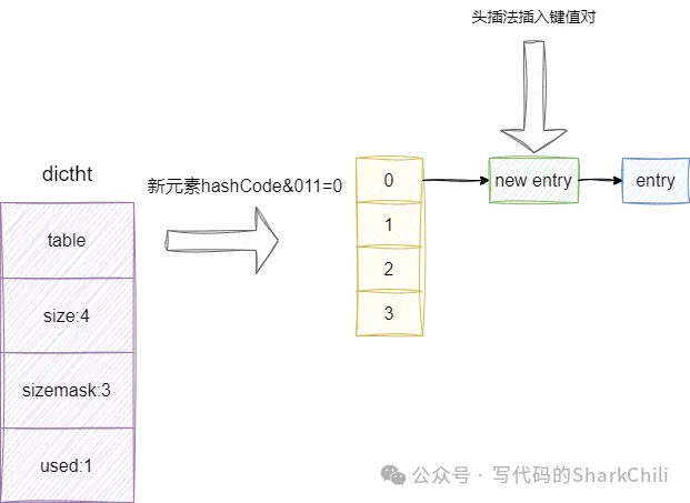 复制int dictAdd(dict *d, void *key, void *val) { //通过dictAddRaw完成key的插入 dictEntry *entry = dictAddRaw(d,key); //如果插入成功再维护value if (!entry) return DICT_ERR; dictSetVal(d, entry, val); return DICT_OK; }1.2.3.4.5.6.7.8.9.dictAddRaw逻辑也比较简单,先检查当前的字典表是否因为大量冲突而处理渐进式哈希(关于渐进式哈希后文会详细讲解,这里也补充一些简单的概念),通过_dictKeyIndex定位到当前元素插入的索引位置,采用头插法将其插入到对应索引位置的链表首部: