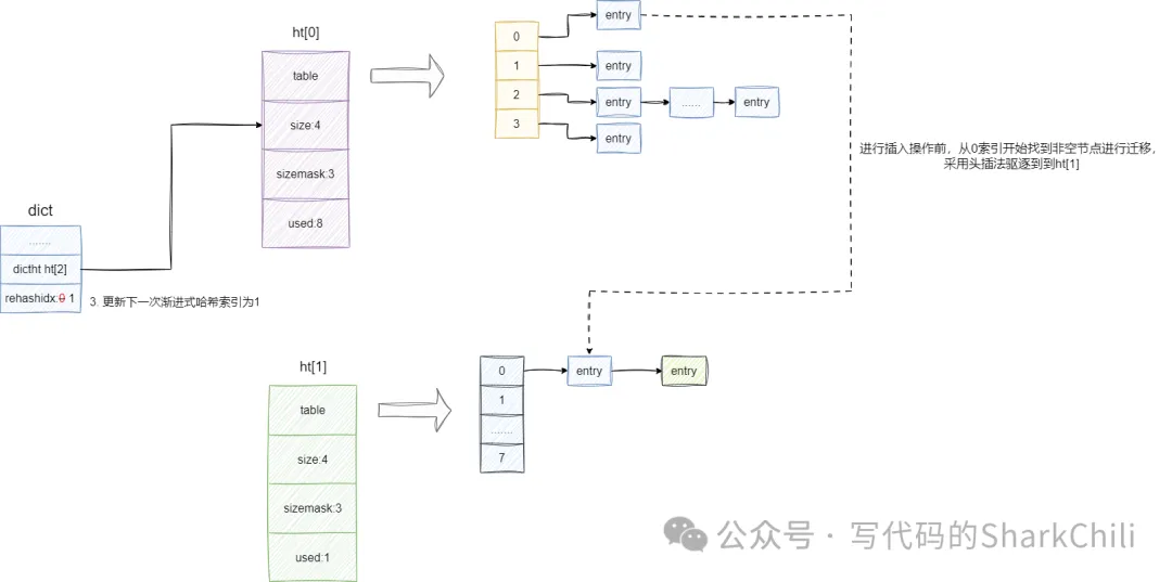 对于旧有存在的元素,考虑到整个哈希表可能存在不可预估数量的键值对,redis的字典会通过渐进式哈希的方式在元素每次进行增删改查操作时将旧有元素逐批次迁移到ht[1]中,一旦所有元素全部迁移到ht[1]后,哈希表就会将ht[1]指向的哈希表指针赋值给ht[0],并将ht[0]原有哈希表释放。