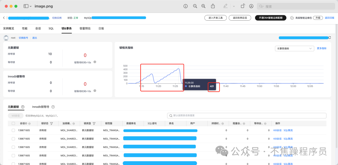 (1) 以上关于锁的截图,可以看到是元数据锁引发的Connection被耗尽,那什么是元数据锁:
