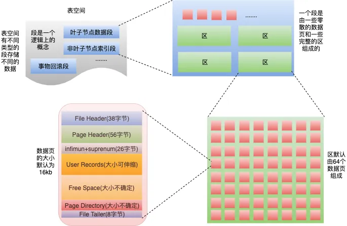 表空间文件的数据结构由段、区、何存页、数据和行组成。