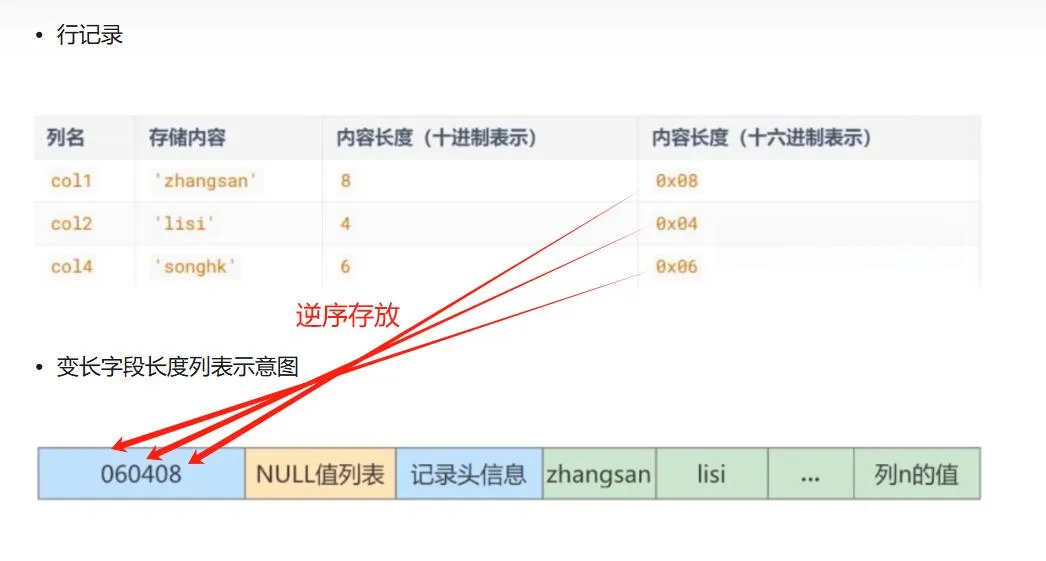 在Compact行格式中,把所有变长字段真实数据占用的字节长度,按照记录列的逆序方式存放在记录的开头部位,形成一个变长字段长度列表。注意当数据表没有变长字段时,比如全部都是int类型字段,这时候表里的行格式就不会有变长字段长度列表。